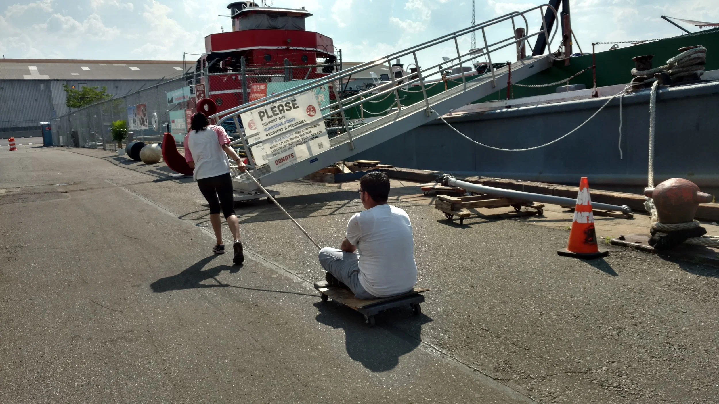 We learn too. A surprise this summer was that the garbage run (taking the garbage six blocks up the pier to the dumpster) was a popular task. Seems it was a voyage, an exploration, fun pushing a shopping cart and pulling dollies. This led to a new game, dolly races.